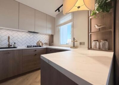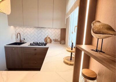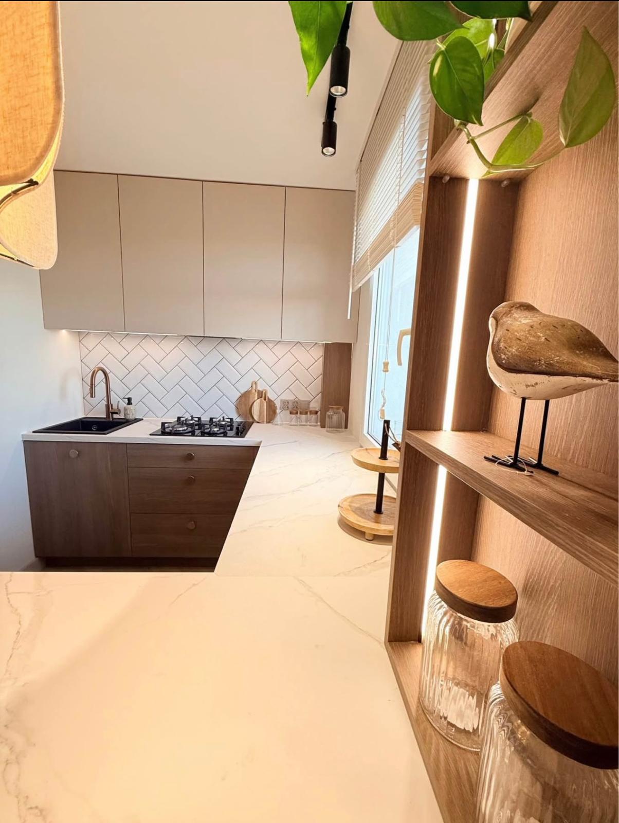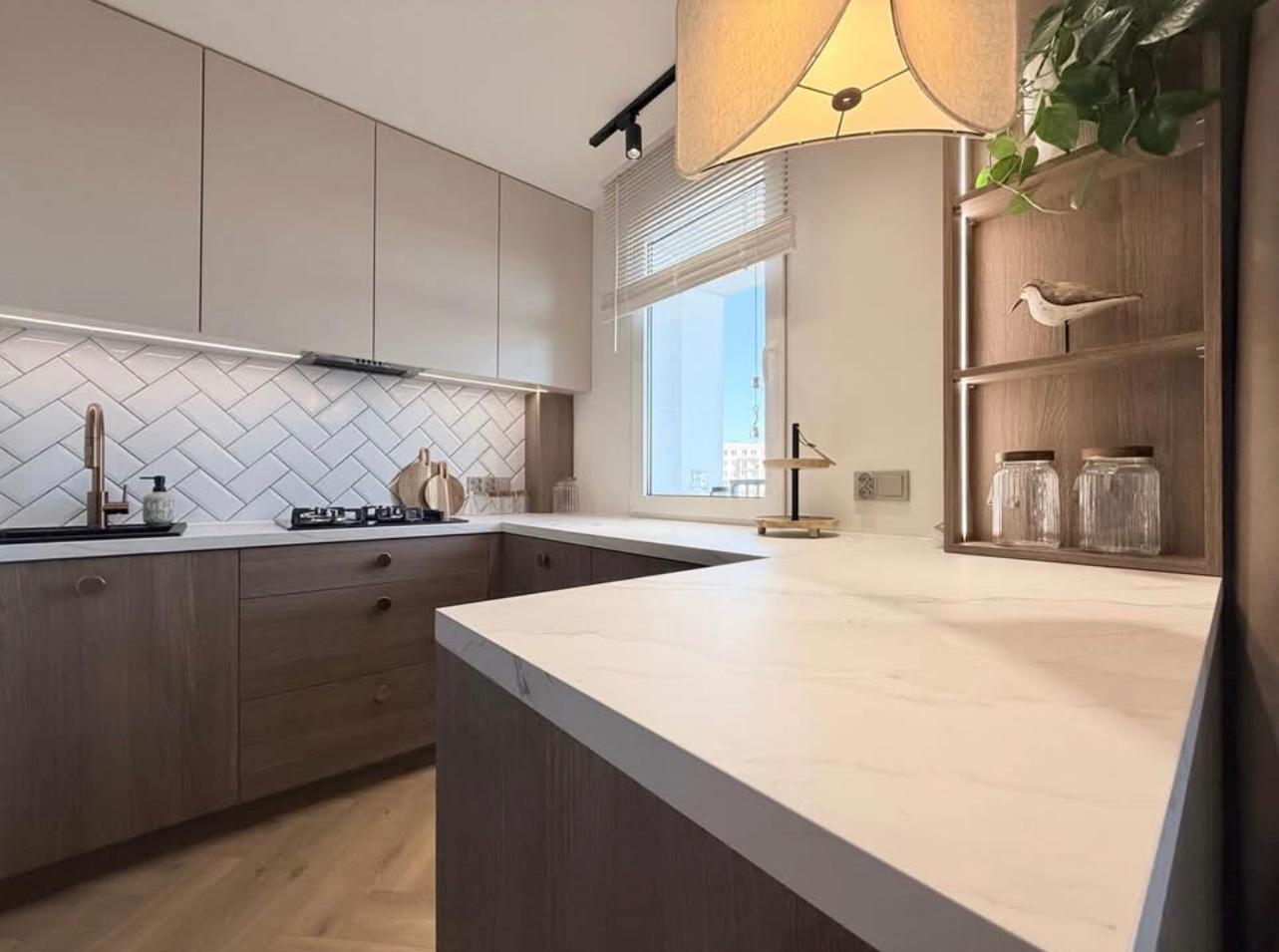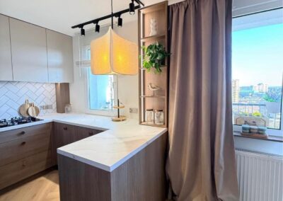 Cała zabudowa na wymiar wykonana przez stolarza. Wszystkie sprzęty Agd nowe na gwarancji.