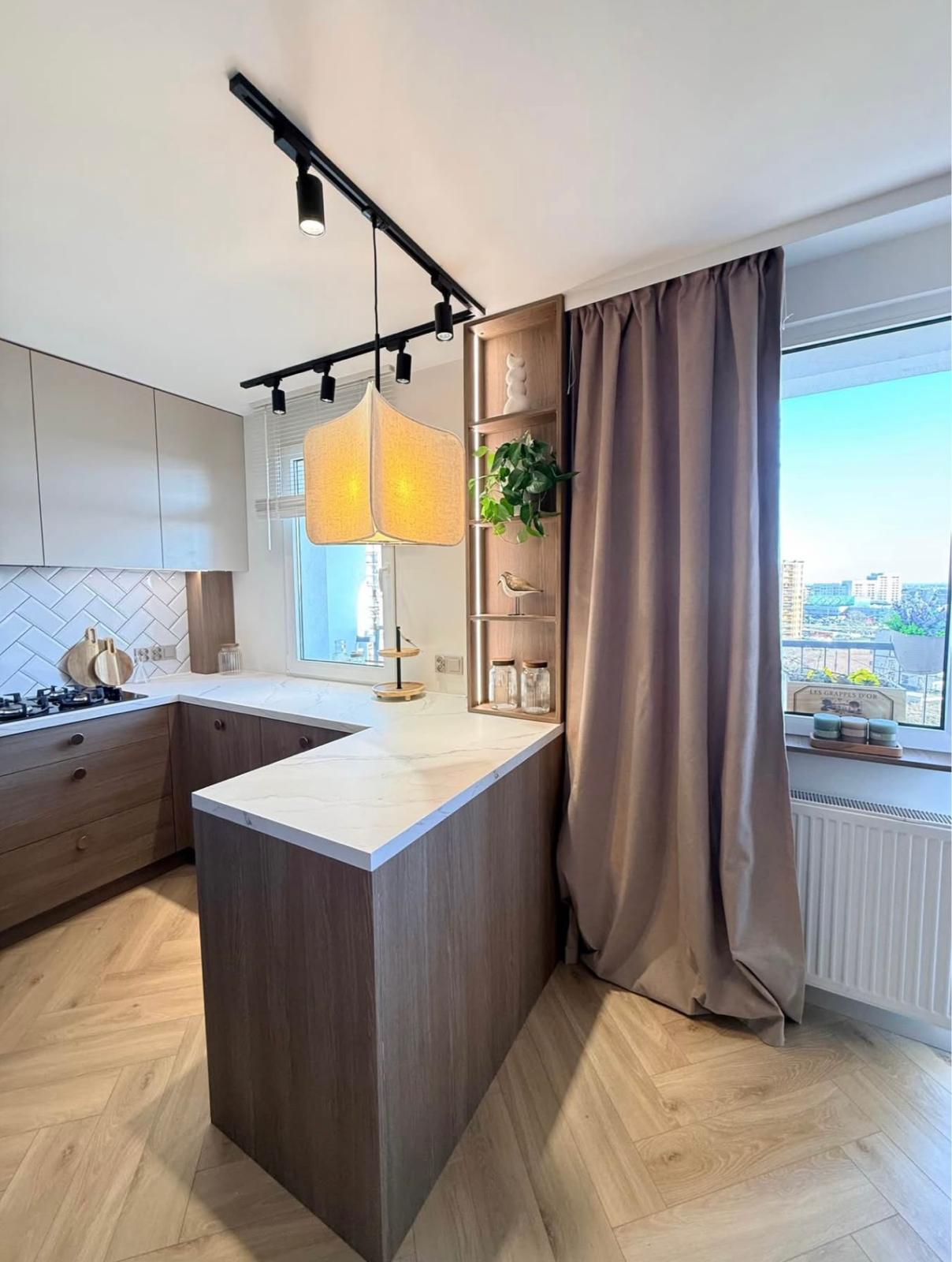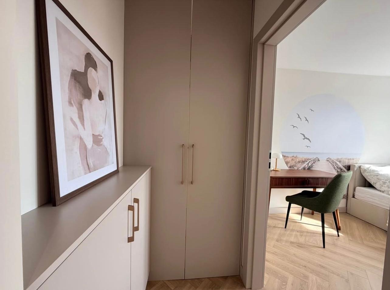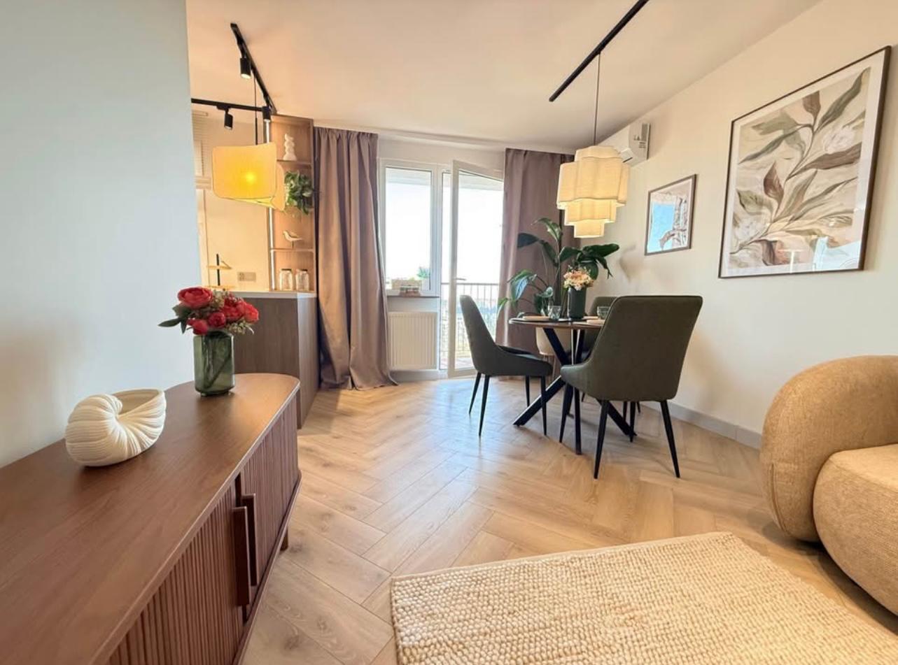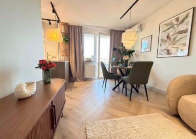 – Klimatyzowany salon z kuchnia we wnęce oddzielonej półwyspem i wyjściem na balkon