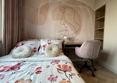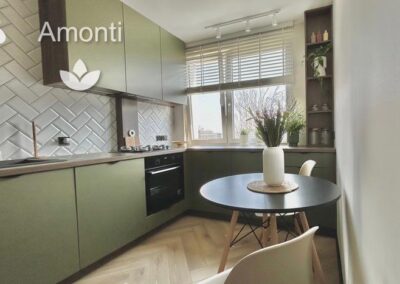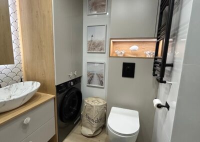Zarówno w kuchni, łazience jak i sypialni zabudowy były wykonane pod wymiar przez stolarza. Dzięki temu ukryto wiele dodatkowej przestrzeni do przechowywania w szafkach tip-on.