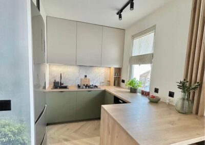 Zarówno w kuchni, łazience jak i sypialni zabudowy były wykonane pod wymiar przez stolarza. Dzięki temu ukryto wiele dodatkowej przestrzeni do przechowywania w szafkach tip-on.