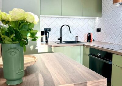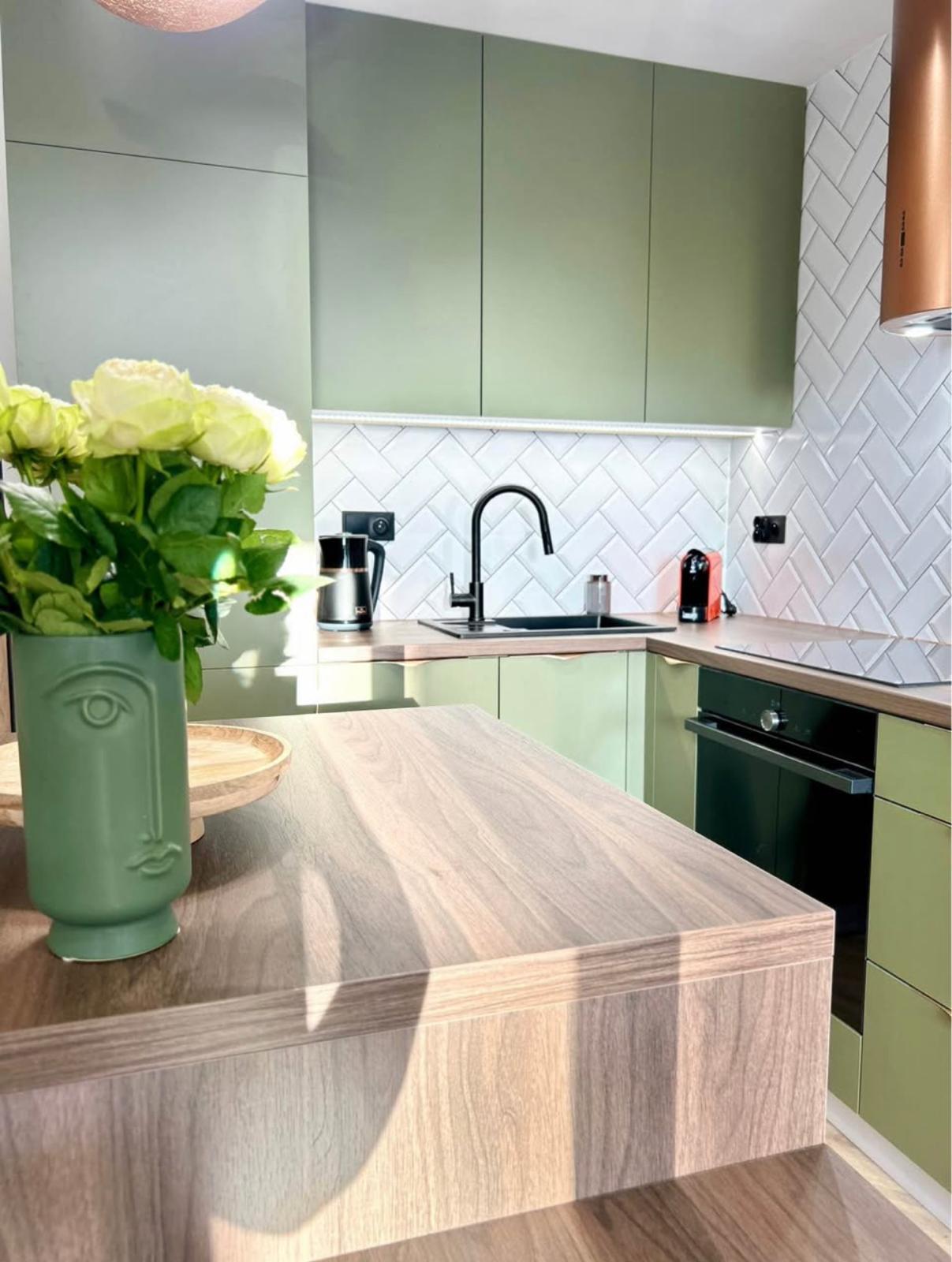 Zarówno w kuchni, łazience jak i garderobie zabudowy były wykonane pod wymiar przez stolarza.
